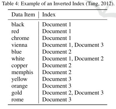 Let's look at an inverted index first before we compare them. An inverted index is... well, an inverted forward index basically. The "key" in the table is now the keyword while the "value" are the data items. Below is also by Kramer et al. (2019):